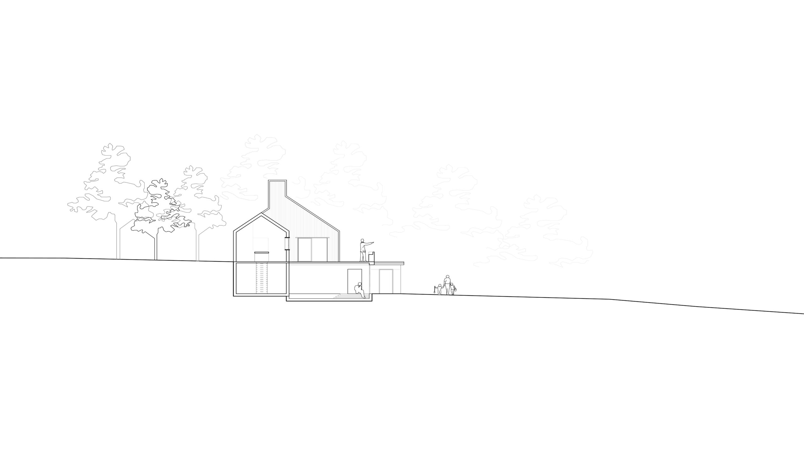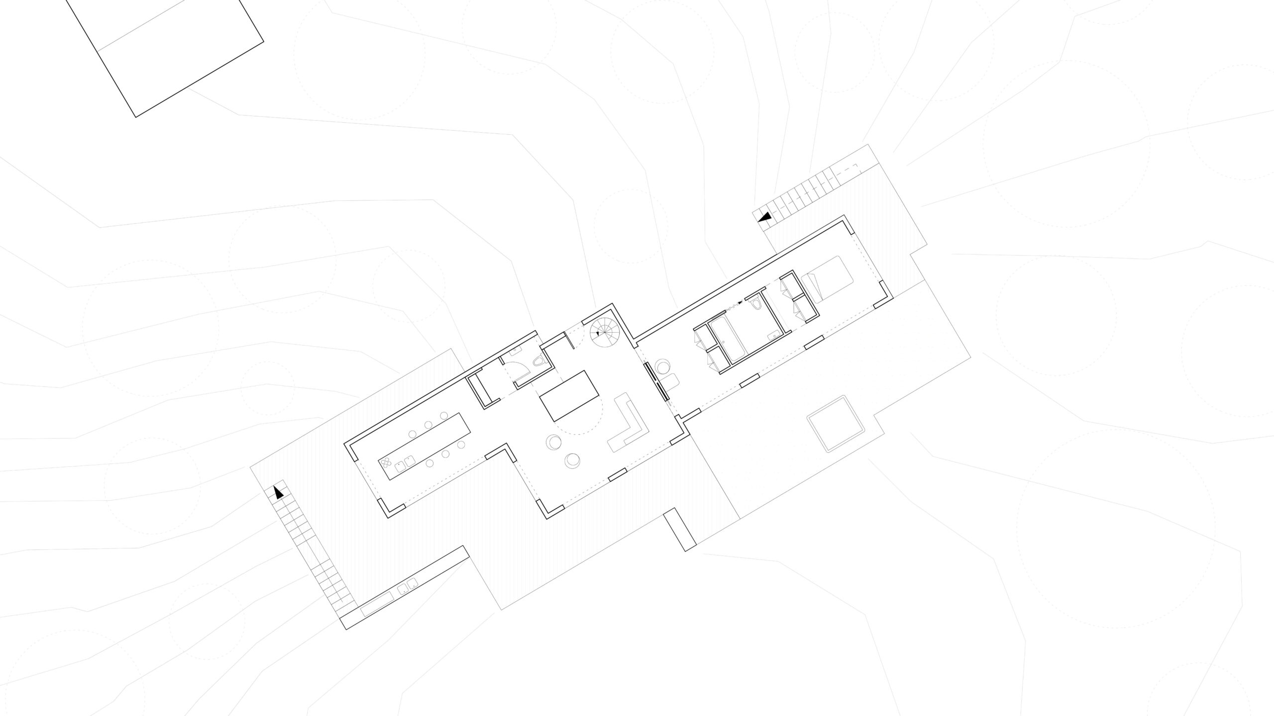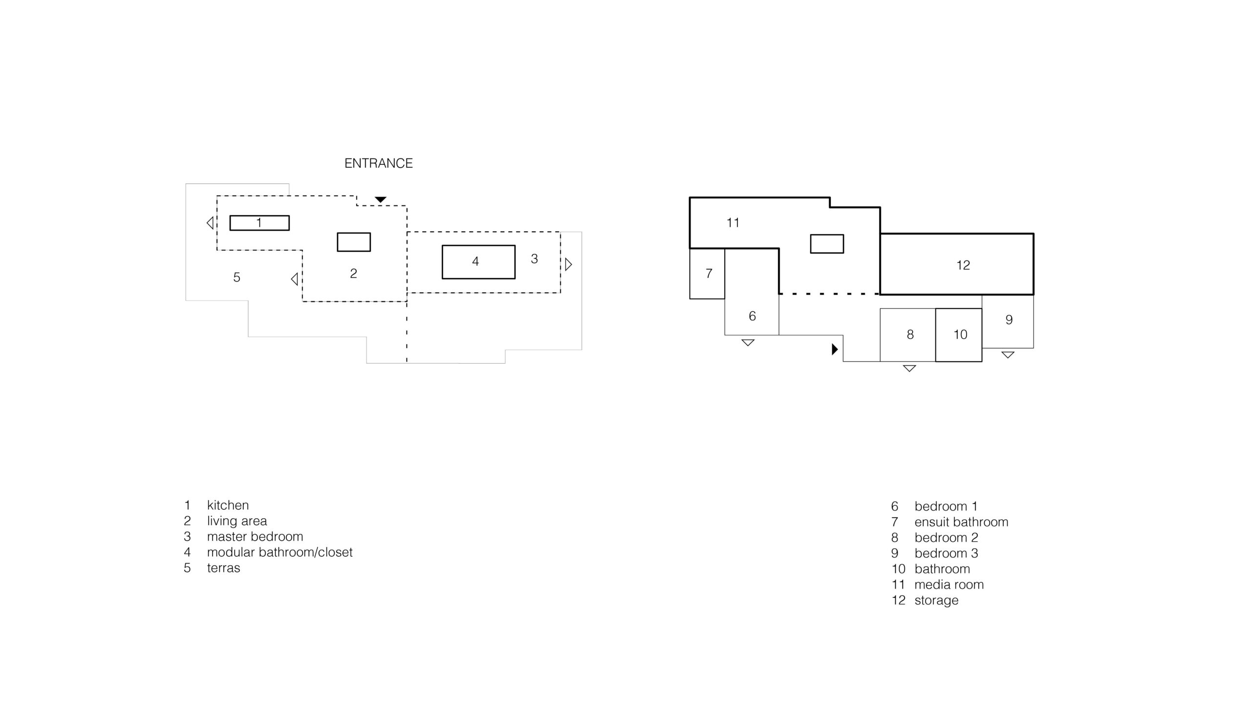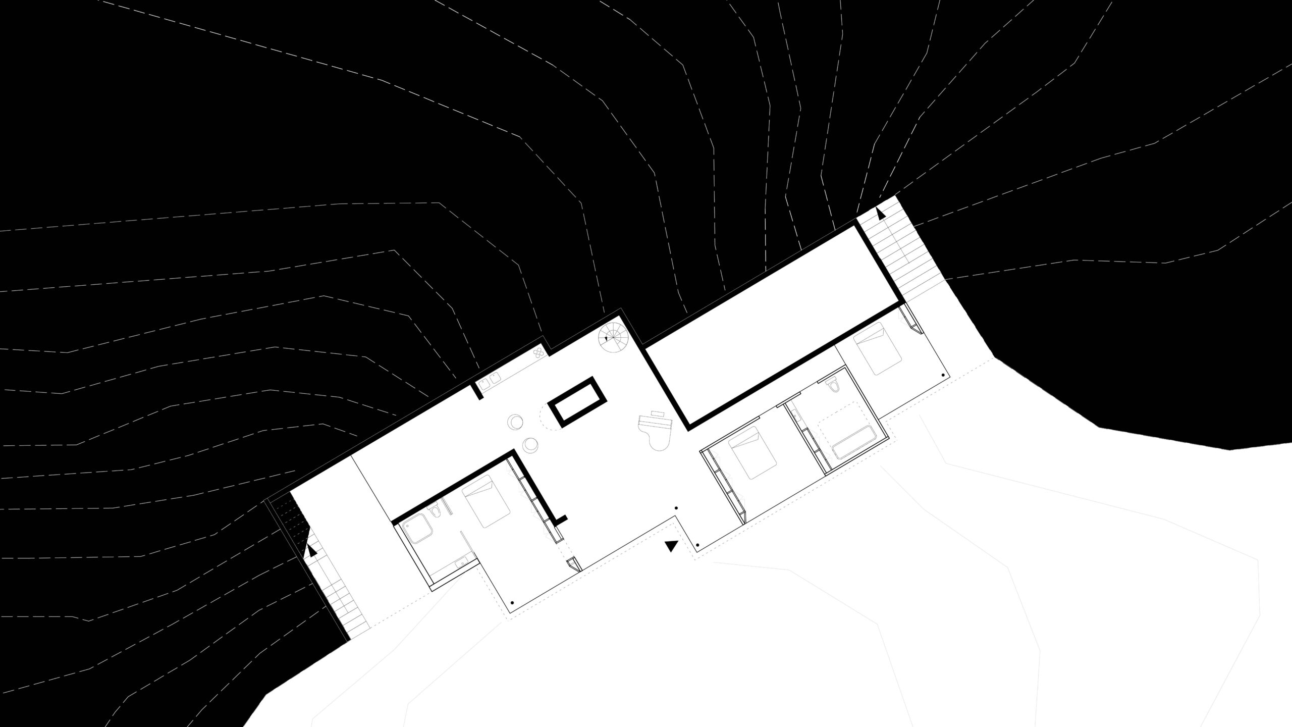 Op de nieuwe benedenverdieping, de oude is vooralsnog ongemoeid gelaten, is ruimte gemaakt voor enerzijds twee tweepersoons kamers met badkamer en aan de andere kant een gastenverblijf met eigen badkamer. Zowel privacy als omsluiting door de natuur spelen hier een belangrijke rol. Het ontwerp is zo minimalistisch mogelijk gehouden om niet te conflicteren met reeds bestaande elementen, glas om de natuurlijke omgeving te reflecteren en te integreren.