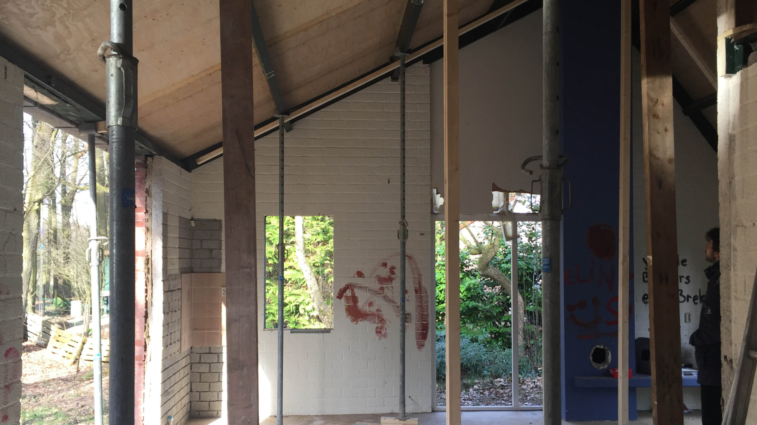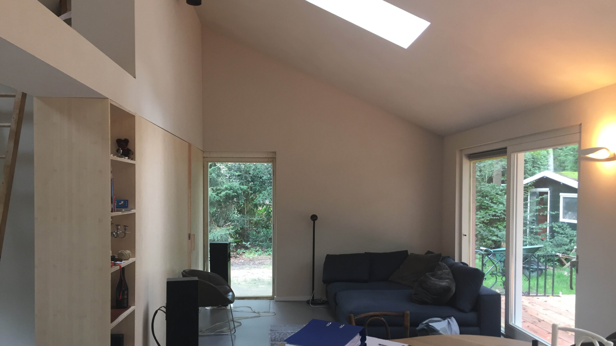 Het resultaat is een sched-like interieur met een grote leefruimte met uitzicht op de bossen. Een unieke woning waar met veel plezier gerecreëerd wordt.