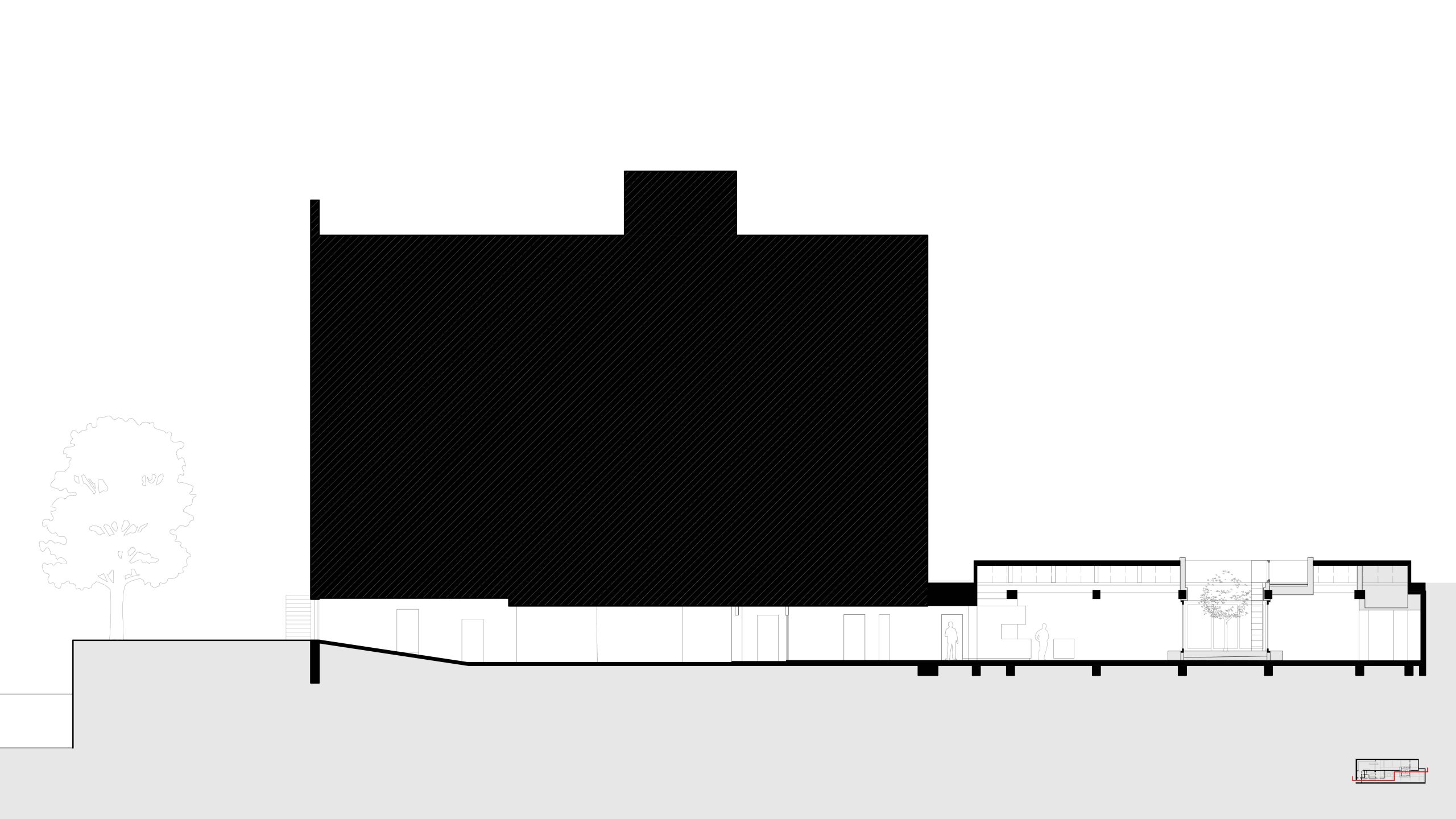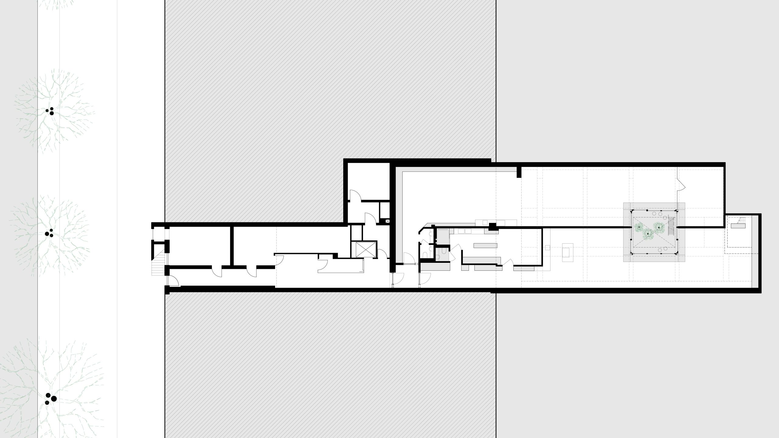Om ervoor te zorgen dat zowel het appartement als de ontwerpstudio optimaal kunnen profiteren van natuurlijk licht en het gebruik van de patio, hebben we een geluidswerende muur in lengterichting geplaatst die het perceel scheidt. Hierdoor kunnen beide ruimtes volledig onafhankelijk functioneren, met afzonderlijke ingangen, installaties en op maat gemaakt meubilair.